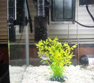 30p水槽、外掛けフィルターでは汽水、海水の水質保持は無理に近いです。考えが甘かった。飼ってから気づきました。それに汽水ということで比重の加減があいまいです。ということで飼育終了。 |