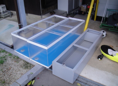 水槽はオーバーフローで1500/450/450が二本、ろ過槽が1200/300/300です。